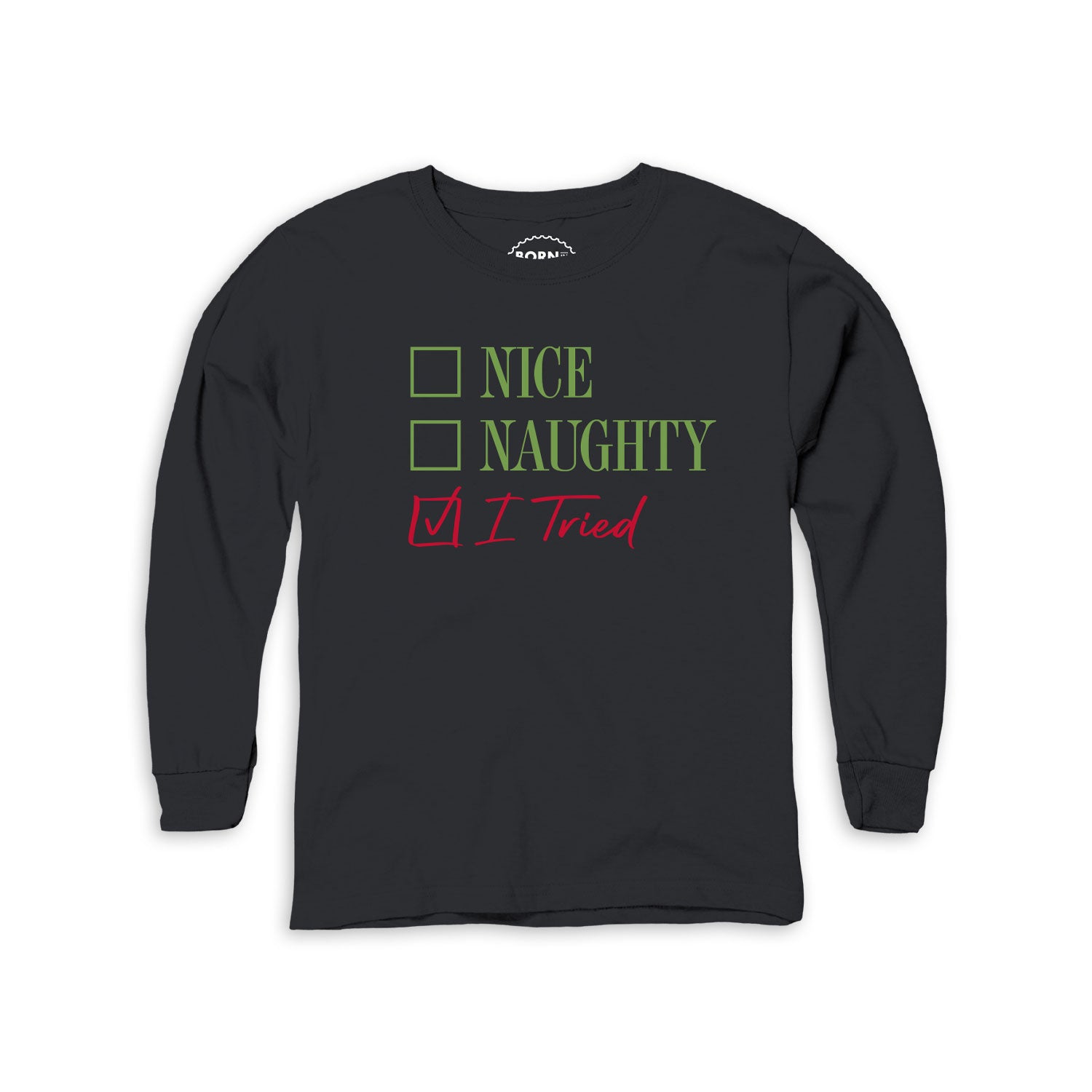 Youth Naughty/Nice...I Tried Long Sleeve T-Shirt - S is backordered and will ship as soon as it is back in stock.